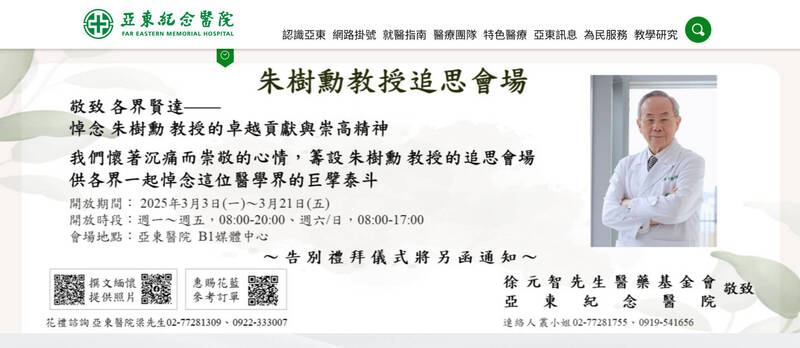 前院長朱樹勳辭世 亞東醫院:3/3~3/21開放會場悼念 - 生活 - 自由時報電子報