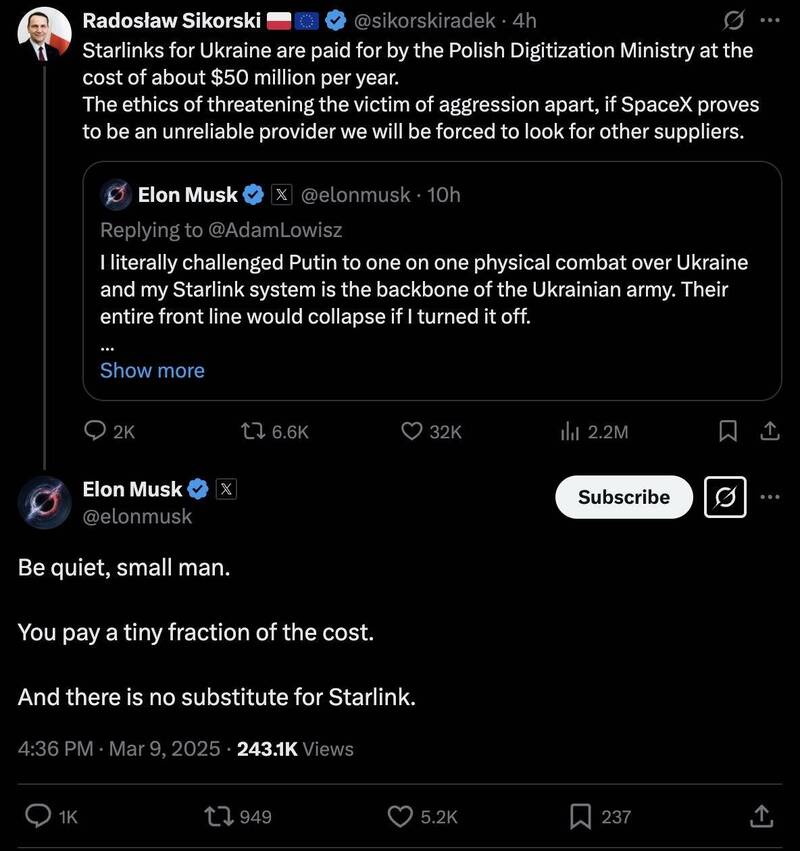 波蘭外長為烏克蘭星鏈槓上馬斯克 反遭嗆「小人物就安靜」 - 國際 - 自由時報電子報